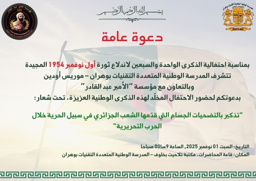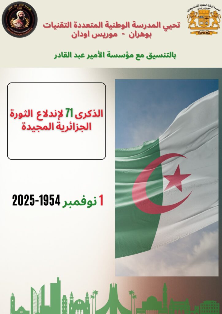 بمناسبة احتفالية الذكرى الواحدة والسبعين لاندلاع ثورة أول نوفمبر 1954 المجيدة, تتشرف المدرسة الوطنية المتعددة التقنيات بوهران – موريس أودين وبالتعاون مع مؤسسة الأمير عبد القادر بدعوتكم لحضور الاحتفال المخلّد لهذه الذكرى الوطنية العزيزة، تحت شعار