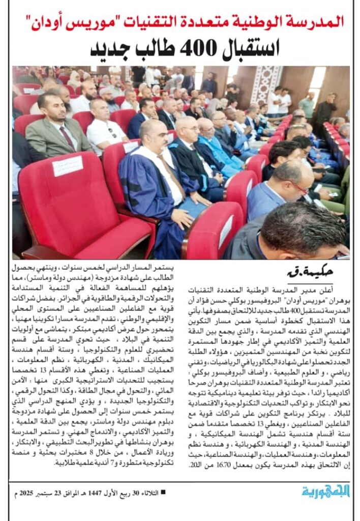 Evénementsمقال صحفي بجريدة الجمهورية يتناول فعاليات استقبال 400 طالب على مستوى المدرسة admin23 septembre 202523 septembre 202501 mins Navigation de l’article Previous: الافتتاح الرسمي للسنة الجامعية 2025-2026 بالمدرسة الوطنية المتعددة التقنيات بوهران موريس أودانNext: « زيارة عمل لدى المجموعة الصناعية « شيالي