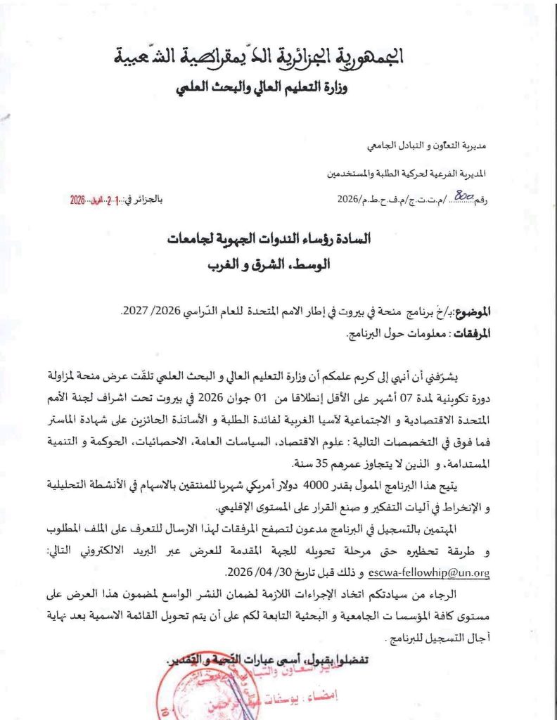 المنح الجامعية مستجداتإعلان منحة تكوينية ممولة بالكامل في اطار الامم المتحدة – بيروت للسنة الدراسية 2026- 2027 admin23 أبريل 202623 أبريل 202601 mins تصفّح المقالات Previous: شهادة شكر وتقدير وعرفان بمناسبة اختتام الأسبوع العلمي للمدرسة