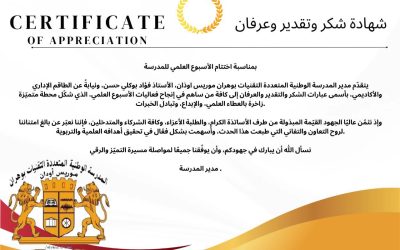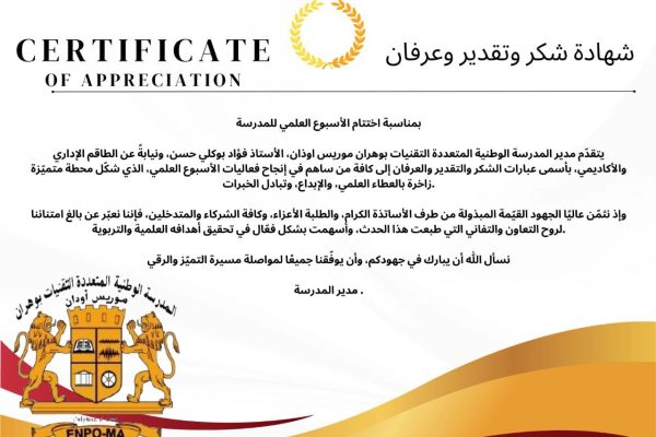 يتقدّم مدير المدرسة الوطنية المتعددة التقنيات بوهران موريس اوذان، الأستاذ فؤاد بوكلي حسن، ونيابةً عن الطاقم الإداري والأكاديمي، بأسمى عبارات الشكر والتقدير والعرفان إلى كافة من ساهم في إنجاح فعاليات الأسبوع العلمي، الذي شكّل محطة متميّزة زاخرة بالعطاء العلمي، والإبداع، وتبادل الخبرات
