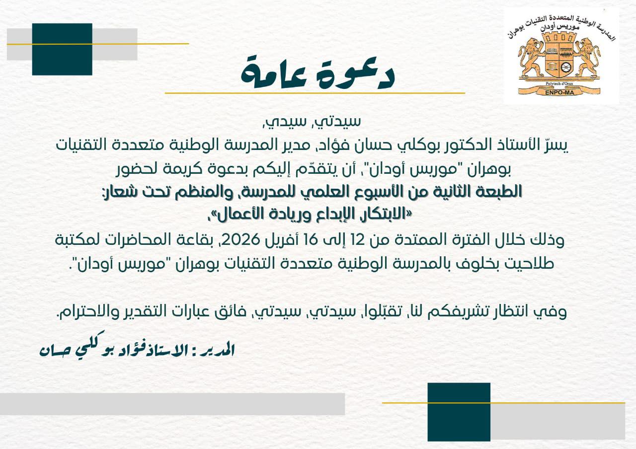 La Direction de l’École Nationale Polytechnique d’Oran Maurice Audin a le grand plaisir de vous inviter à participer à la deuxième édition de la Semaine Scientifique, qui se tiendra du 12 au 16 avril 2026, autour des thématiques de l’innovation, de la recherche et de l’entrepreneuriat.
