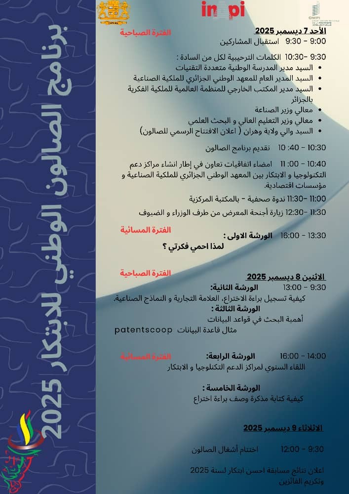 Sous le haut patronage du Ministère de l’Enseignement supérieur et de la Recherche scientifique, du Ministère de l’Industrie et de la Wilaya d’Oran, l’École polytechnique nationale d’Oran Maurice-Audin est honorée d’organiser la 15e édition du Salon national de l’innovation en coordination avec l’Institut national algérien de la propriété industrielle, qui représente une plateforme essentielle pour l’échange de connaissances et la présentation des capacités nationales dans le domaine de la technologie et de l’innovation.
